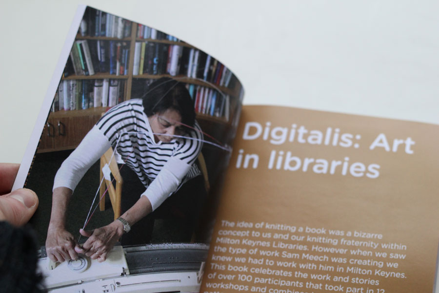 Developed through a series of workshops with library users and knitting groups across Milton Keynes which explore ways in which books and be ‘digitised’ and knitted, through binary encryption, figurative pixel art, and scanning. Over 50